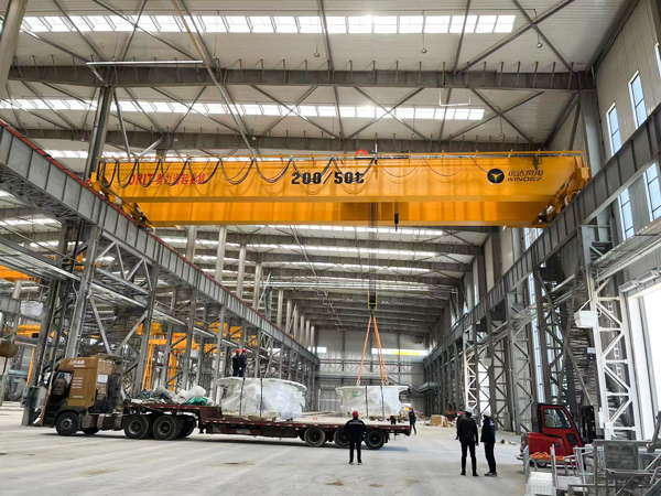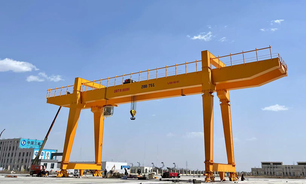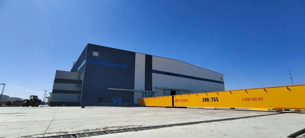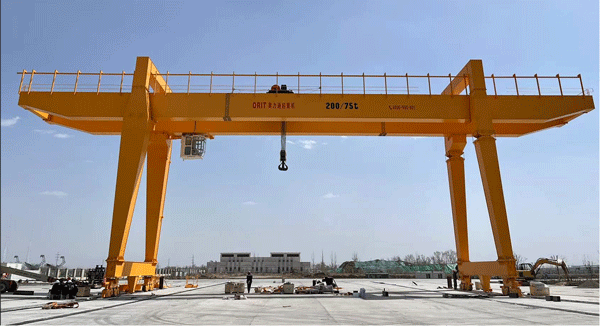 采用柔性技术和优化设计的今年会200tx52m双梁门式起重机,如大漠雄鹰,屹立在内蒙古乌兰察布市运达风电智能产业基地。