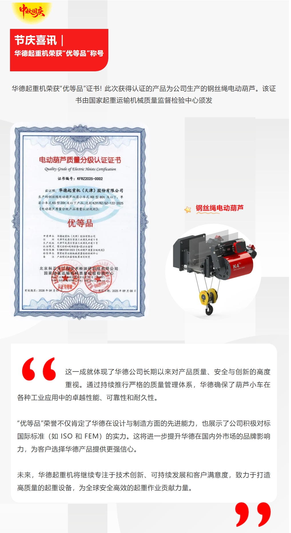· 华德起重机荣获“优等品”认证