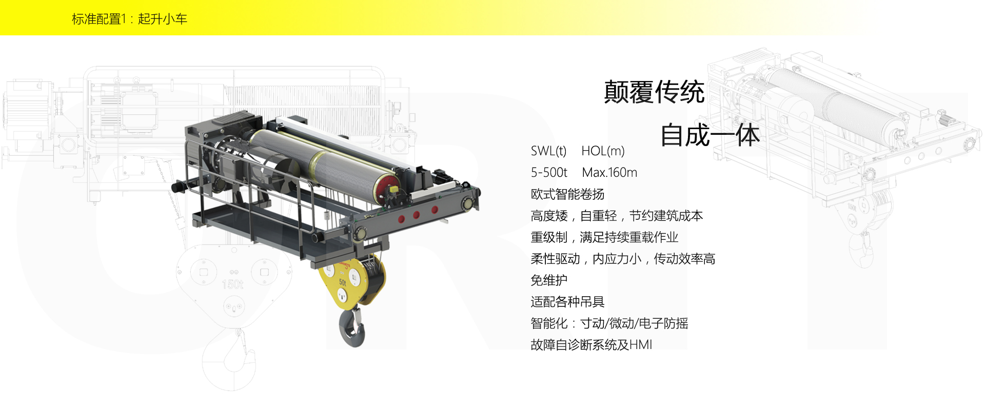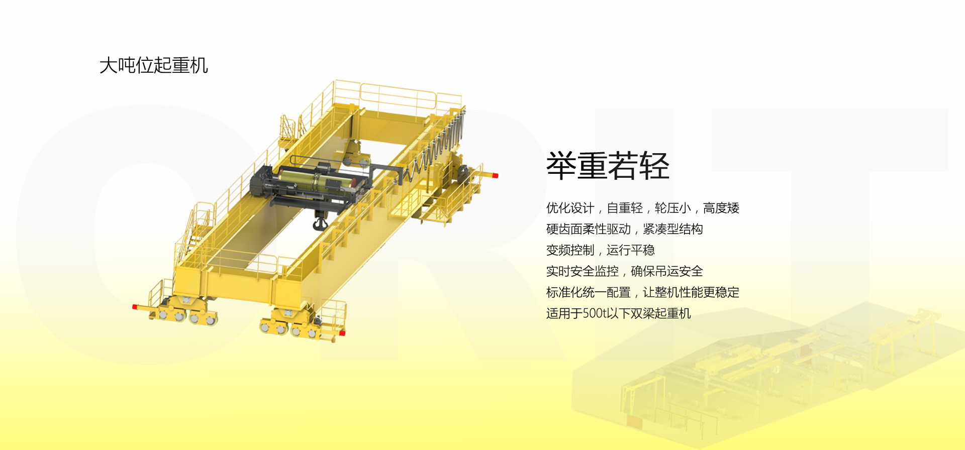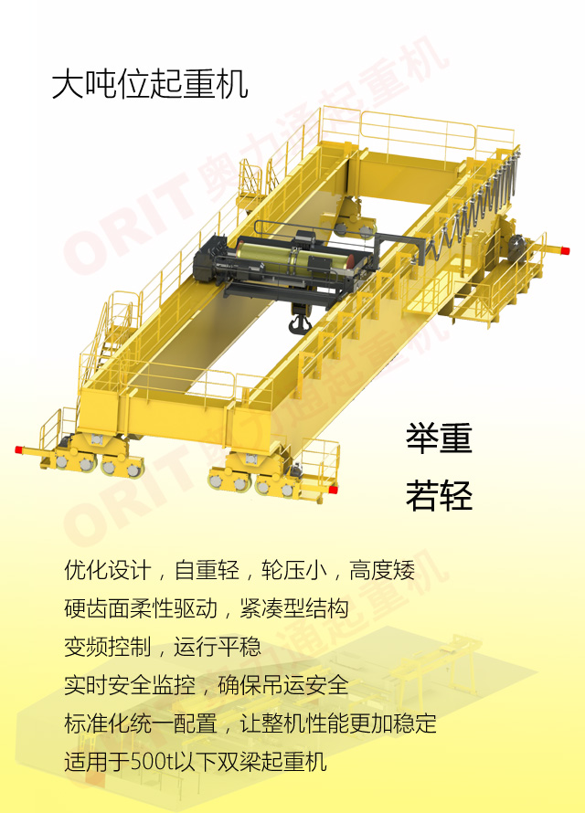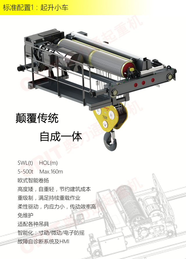 产品名称:大吨位起重机 优化设计,自重轻,轮压小,高度矮 硬齿面柔性驱动,紧凑型结构 变频控制,运行平稳 实时安全监控,确保吊运安全 标准化配置,让性能无比稳定 适用于500t以下双梁起重机 标准配置1:起升机构 颠覆传统,自成一体 SWL(t) HOL(m) 5-500t Max.160m 欧式智能卷扬 高度矮,自重轻,节约建筑成本 重级制,满足持续重载作业 柔性驱动,内应力小,传动效率高 免维护 适配各种吊具 智能化:寸动/微动/电子防摇 故障自诊断系统及HMI 标准配置2:三合一驱动 静音科技,静享搬运 结构紧凑,铝合金壳体,密封 变频电机+硬齿面减速箱+盘式制动器 龙门专用C型三合一集成化设计,节约空间 全变频调速 最高转速4800 r/min 防护等级IP55 半油脂润滑,免维护 静音科技,静享搬运 标准配置3:电控系统 安全随心掌控 智能安全监控器 计算起升机构剩余安全工作时间 累计起升工作时间 累计超载次数 累计起升电机启动次数 起升电机过热保护及报警 刹车片厚度报警 ... ... 远程通讯 施耐德电气元件 航空插座接口 IP55防护等级 互联网+ HIM人机交互界面 无线远程控制 物联网远程管理 4G移动通讯 远程诊断系统 信息系统 自动化 速度扩展功能 电子防摇功能 自动纠偏功能 寸动功能 防冲击功能 自动中心定位 同步功能 标准配置4:端梁 多变灵活,适应自如 模块化直驱设计 自重轻、体积小 多种连接方式,安装尺寸灵活 适用各种厂房,降低厂房高度 QT700车轮,自润滑,更静音 采用调心轴承,适应更自如 应用