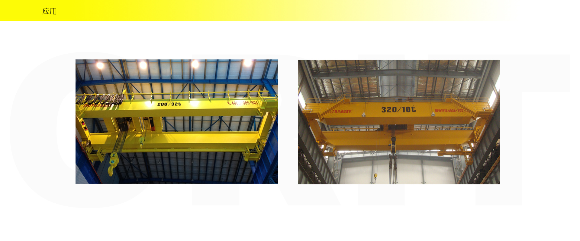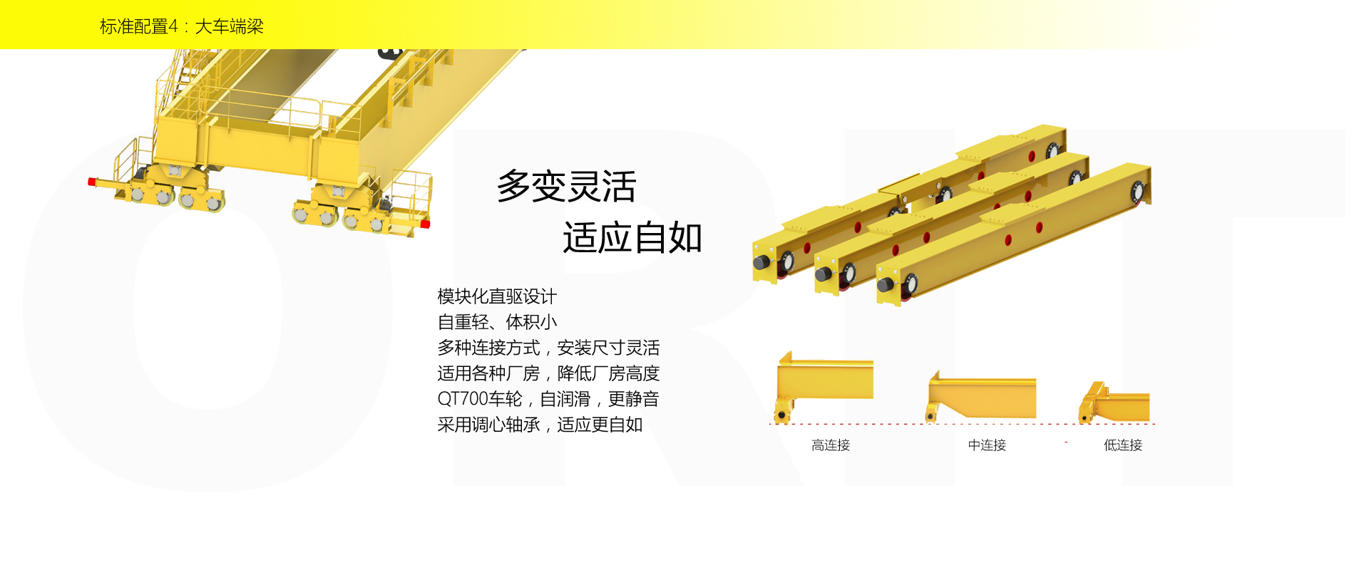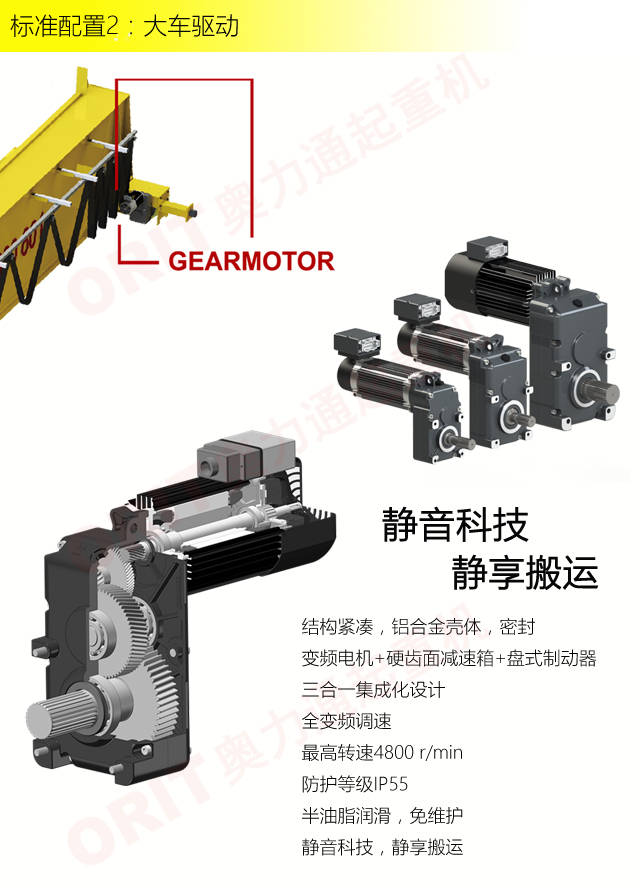 产品名称:大吨位起重机 优化设计,自重轻,轮压小,高度矮 硬齿面柔性驱动,紧凑型结构 变频控制,运行平稳 实时安全监控,确保吊运安全 标准化配置,让性能无比稳定 适用于500t以下双梁起重机 标准配置1:起升机构 颠覆传统,自成一体 SWL(t) HOL(m) 5-500t Max.160m 欧式智能卷扬 高度矮,自重轻,节约建筑成本 重级制,满足持续重载作业 柔性驱动,内应力小,传动效率高 免维护 适配各种吊具 智能化:寸动/微动/电子防摇 故障自诊断系统及HMI 标准配置2:三合一驱动 静音科技,静享搬运 结构紧凑,铝合金壳体,密封 变频电机+硬齿面减速箱+盘式制动器 龙门专用C型三合一集成化设计,节约空间 全变频调速 最高转速4800 r/min 防护等级IP55 半油脂润滑,免维护 静音科技,静享搬运 标准配置3:电控系统 安全随心掌控 智能安全监控器 计算起升机构剩余安全工作时间 累计起升工作时间 累计超载次数 累计起升电机启动次数 起升电机过热保护及报警 刹车片厚度报警 ... ... 远程通讯 施耐德电气元件 航空插座接口 IP55防护等级 互联网+ HIM人机交互界面 无线远程控制 物联网远程管理 4G移动通讯 远程诊断系统 信息系统 自动化 速度扩展功能 电子防摇功能 自动纠偏功能 寸动功能 防冲击功能 自动中心定位 同步功能 标准配置4:端梁 多变灵活,适应自如 模块化直驱设计 自重轻、体积小 多种连接方式,安装尺寸灵活 适用各种厂房,降低厂房高度 QT700车轮,自润滑,更静音 采用调心轴承,适应更自如 应用