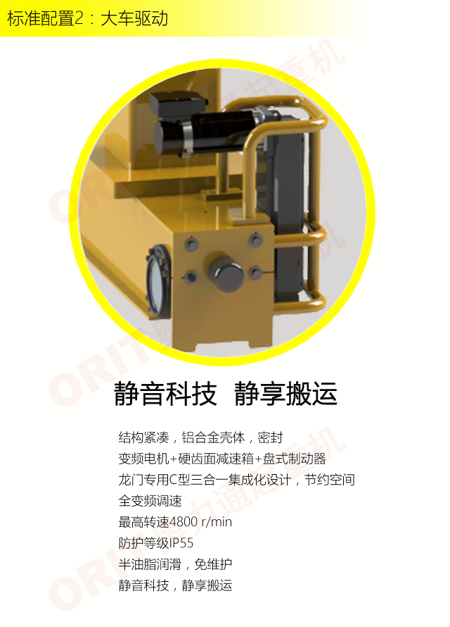产品名称:单梁门式起重机 小巧玲珑,节省空间 优化设计,结构紧凑 柔性支腿,有效释放应力,延长结构寿命 柔性支腿,让龙门小巧玲珑,节省空间 变频控制,运行平稳 实时安全监控,确保吊运安全 标准化配置,让性能无比稳定 无牛腿车间搬运的最佳解决方案 适用于20t以下额定载荷起吊 标准配置1:起升机构 颠覆传统,自成一体 低净空设计 柔性驱动,内应力小,传动效率高 重级制电机,接电持续率60%ED 行走变频无极调速,运行平稳 自调试电磁盘式制动器,可靠,防尘 2160N/mm² 高强度镀锌钢丝绳,免维护 全周型导绳器,防松绳 全系标配安全监控系统 标准配置2:三合一驱动 静音科技,静享搬运 结构紧凑,铝合金壳体,密封 变频电机+硬齿面减速箱+盘式制动器 龙门专用C型三合一集成化设计,节约空间 全变频调速 最高转速4800 r/min 防护等级IP55 半油脂润滑,免维护 静音科技,静享搬运 标准配置3:电控系统 安全随心掌控 智能安全监控器 计算起升机构剩余安全工作时间 累计起升工作时间 累计超载次数 累计起升电机启动次数 起升电机过热保护及报警 刹车片厚度报警 ... ... 远程通讯 施耐德电气元件 航空插座接口 IP55防护等级 标准配置4:端梁 多变灵活,适应自如 模块化直驱设计 自重轻、体积小 多种连接方式,安装尺寸灵活 适用各种厂房,降低厂房高度 QT700车轮,自润滑,更静音 采用调心轴承,适应更自如 应用